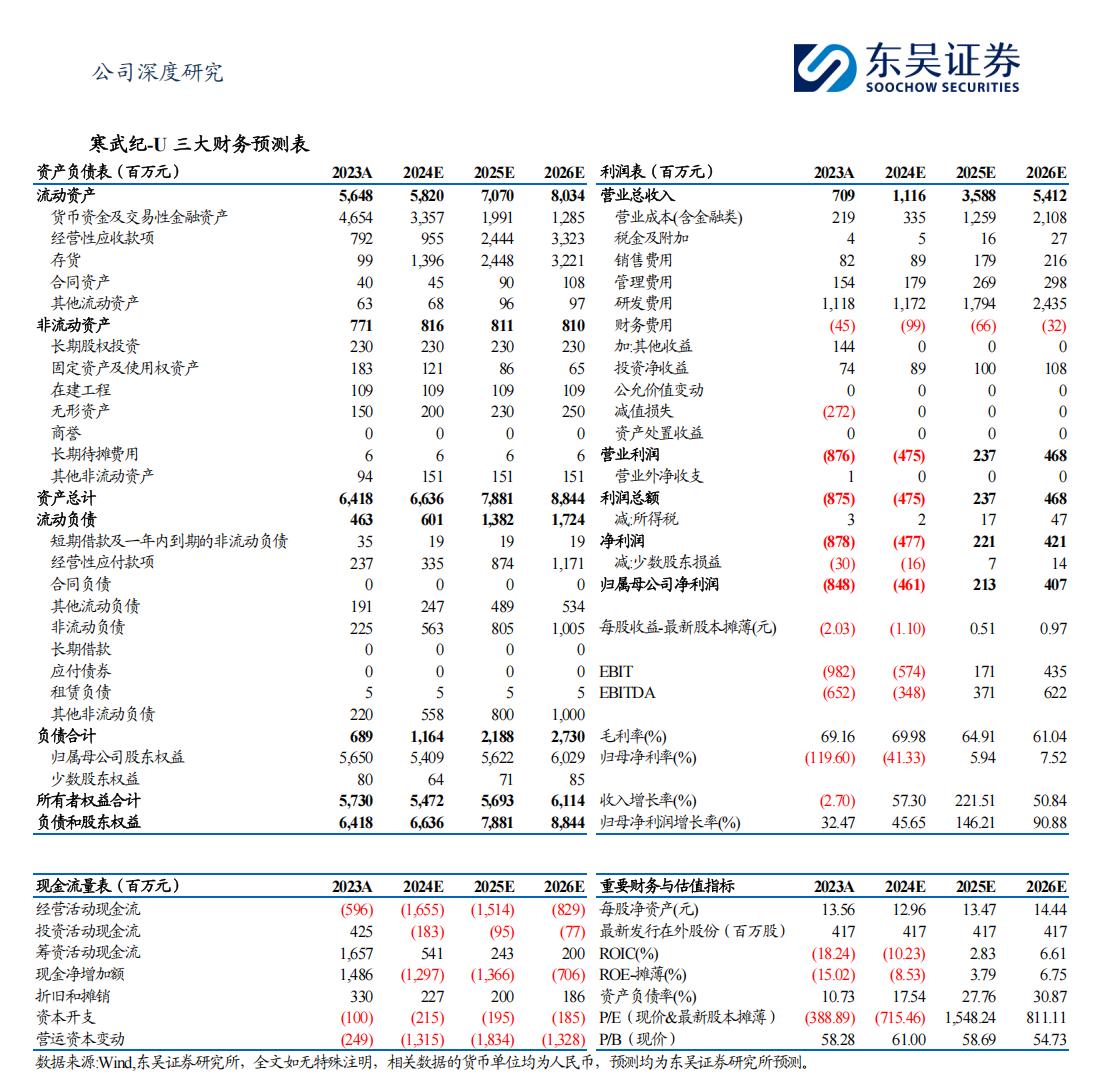 寒武纪未来运营前景乐观,受益于中国AI基础设施建设,寒武纪2024年-2027年收入CAGR预计30%。但受美国制裁限制先进制造工艺,产品竞争力需持续提升,市场份额扩大依赖本地化政策支持。